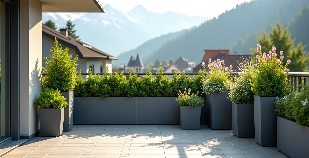 Moderne Materialien wie Fiberglas oder hochwertiger, recycelter Kunststoff bieten hier klare Vorteile. Sie sind nicht nur deutlich leichter, sondern auch wasserundurchlässig und somit extrem frostbeständig. Während ein glasierter Tontopf als „bedingt frostfest“ gilt und bei extremen Minusgraden dennoch Risse bekommen kann, halten Fiberglas-Töpfe Temperaturen bis zu -50°C stand. Diese Eigenschaften machen sie zur idealen Wahl für Schweizer Balkone, die strengen Wintern ausgesetzt sind.